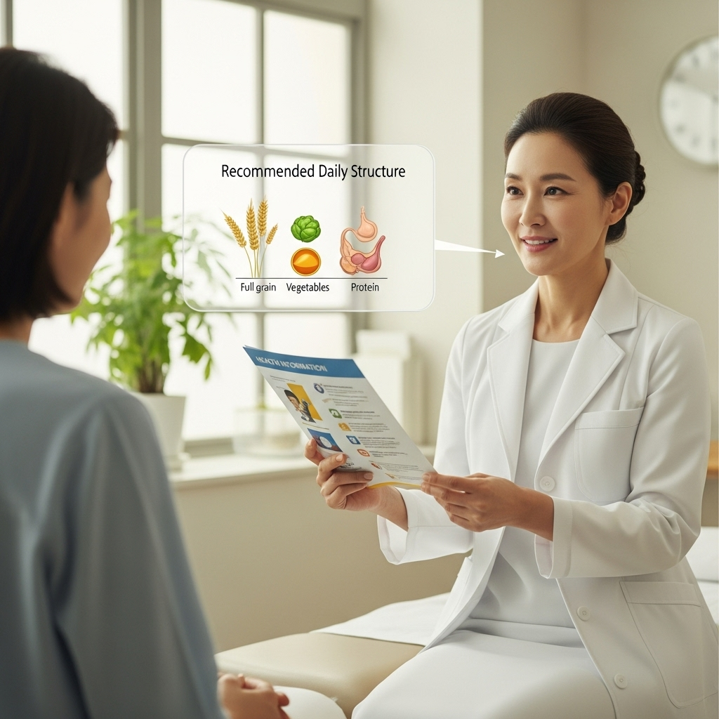 - 복합 탄수화물 + 식이섬유 중심