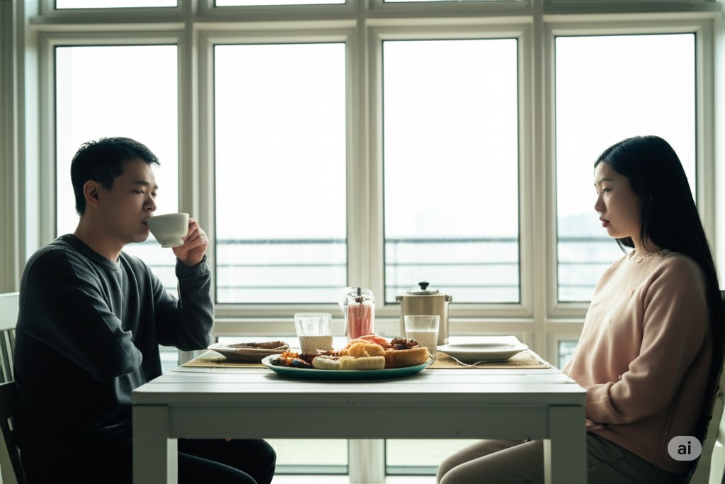 사랑도, 갈등도 없고, 그냥 일상적 동거 상태인 부부. 감정 자체가 무뎌져 모든 접촉을 회피하는 상태입니다.