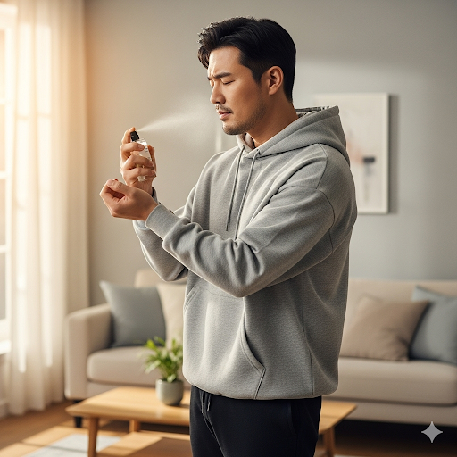 향수 사용 후 고민하는 한국인 남성