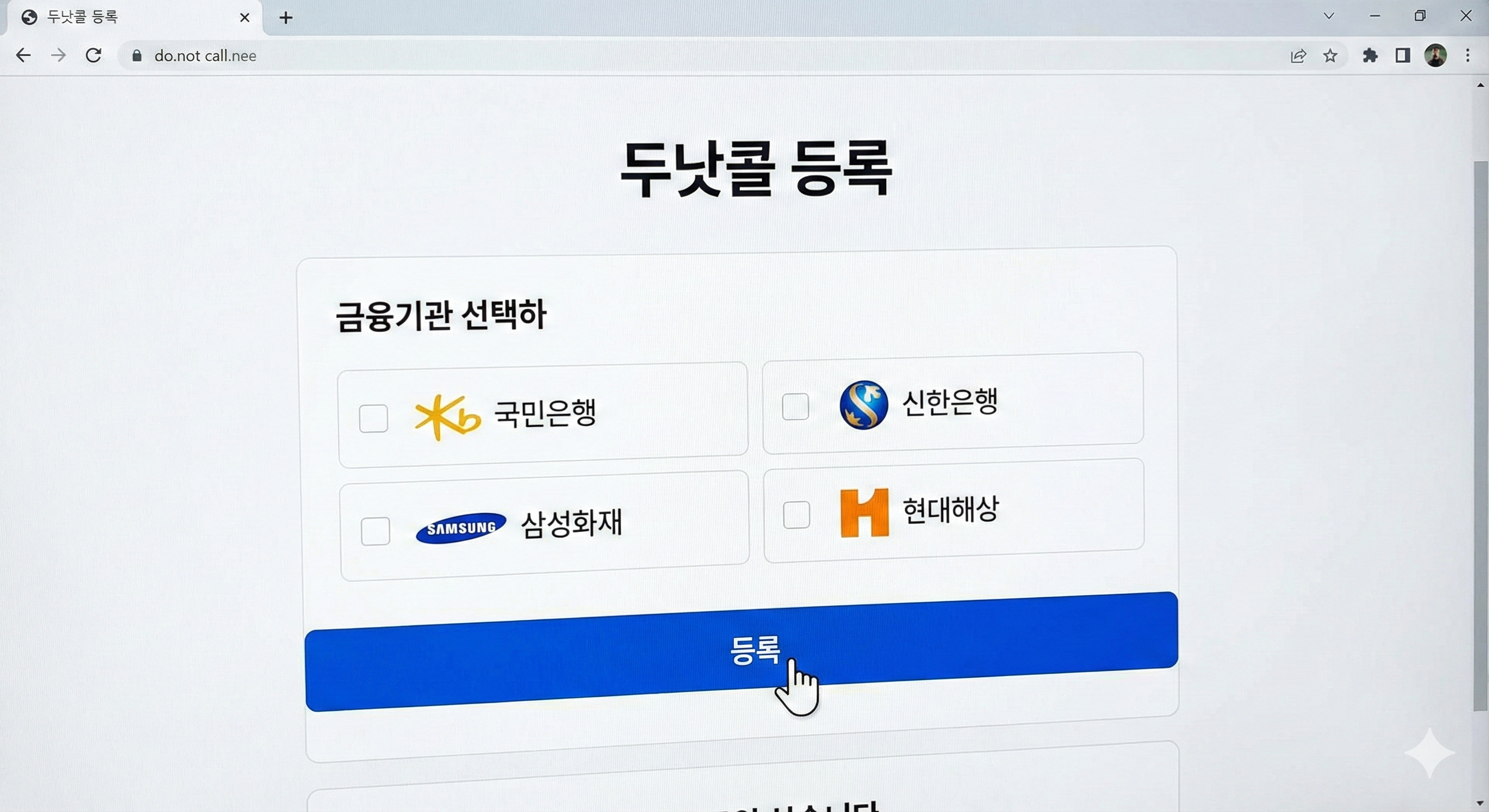 포털 사이트에 '두낫콜'을 검색하거나 공식 홈페이지(www.donotcall.or.kr)에 접속합니다. 메인 화면의 [두낫콜 등록] 버튼을 클릭하세요.