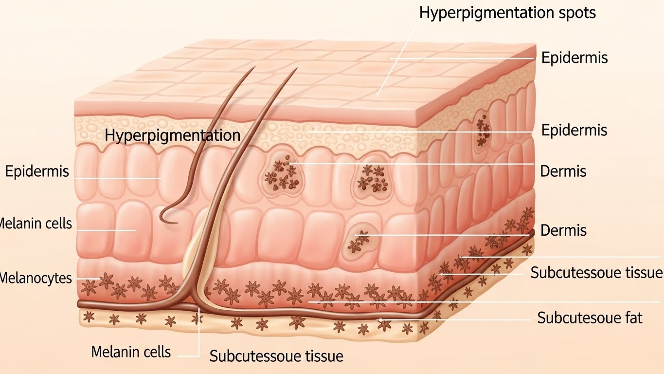 자외선, 호르몬, 염증 등으로 멜라닌이 과잉 생성되어 표피나 진피에 침착됩니다.