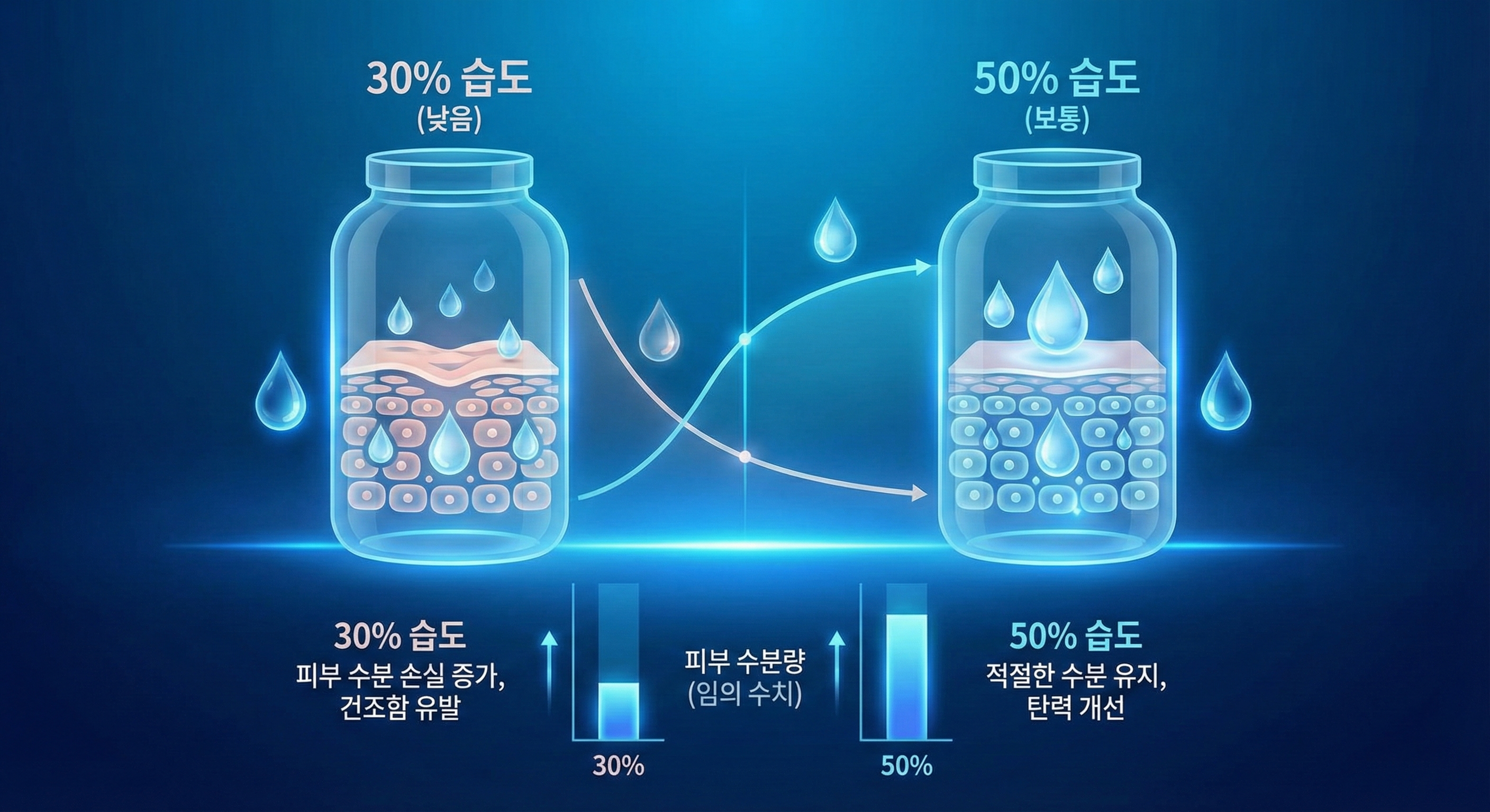 - 습도 30% 이하 → 각질층 수분량 10~12% - 습도 45~50% → 각질층 수분량 18~22% (출처: 대한피부과학회 2022)