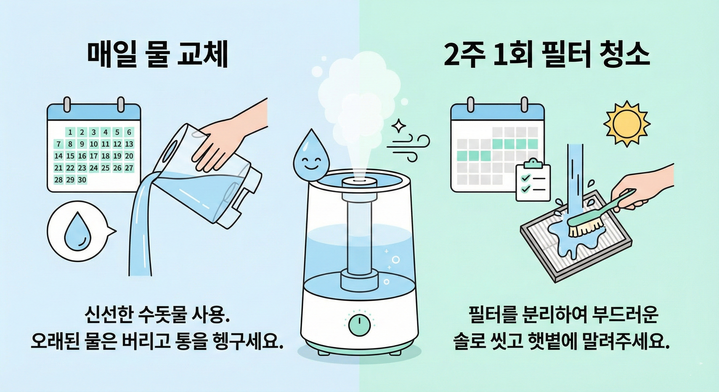 가습기 물통을 2일 이상 교체하지 않으면 세균과 곰팡이가 번식할 수 있습니다.